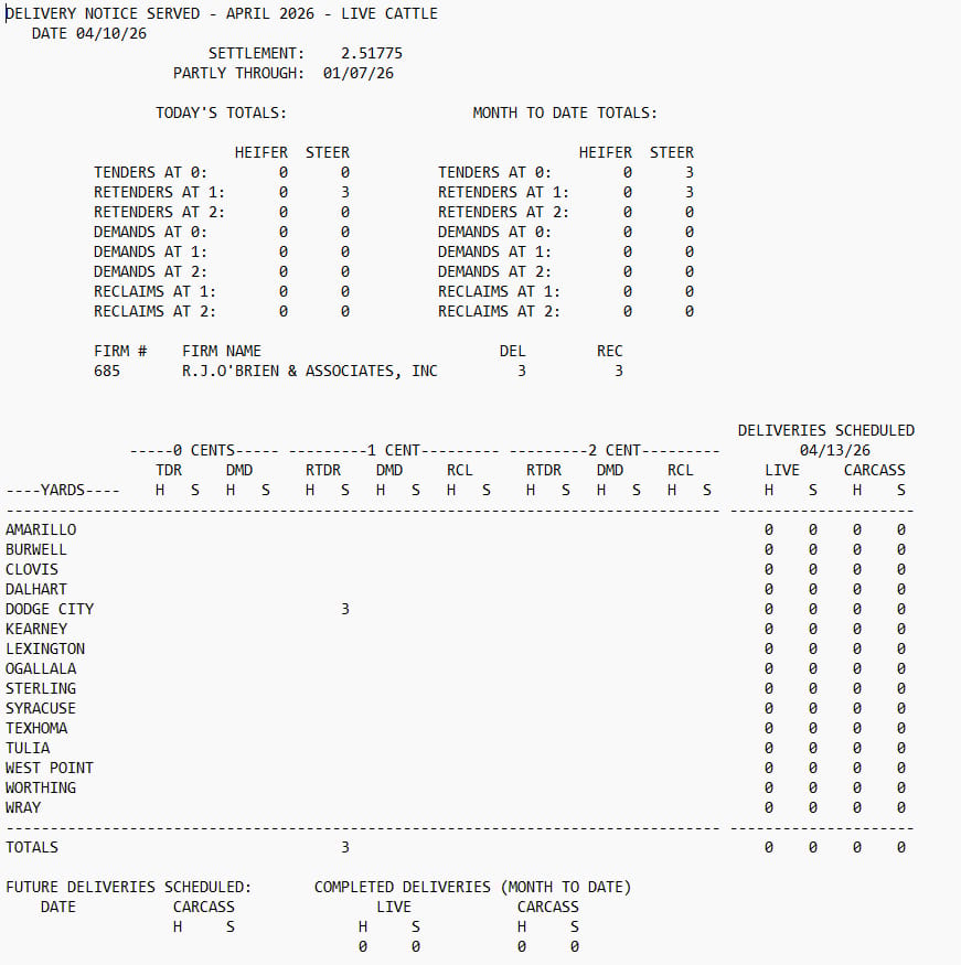 If we see more loads tendered, expect April futures to stall out as more than 10,000 longs will be looking to exit their positions before taking delivery of the physical animals. If I have a long(bought futures) position in April right now, I'm at risk of delivery. If delivery notice gets tendered(1st round) to me, because I'm the oldest long, I can retender it by exiting(selling) my contract and I don't have to take the cattle. Then that load gets tendered(2nd round) to the next oldest long after me. That person can also retender it to avoid delivery. But if that load is still getting tendered, the 3rd person(the following oldest long) to get tendered on has to take delivery, not negotiable. Not many people are ok with being that 3rd person, and I'd guess someone from RJO is going to be that person tomorrow. It does that person no good to buy cattle at today's $250.65 close and resell it into a lower cash market. But if they think cash is going to be higher than $250.65 this week, they might be fine with it, but unlikely this is the reason. While unsure of cash this week, everyone was exiting longs today, keeping April from rallying. It's going to be an interesting couple weeks, with feedyards still holding the leverage, but the board flipping the basis. Stay tuned and keep those longs fresh.