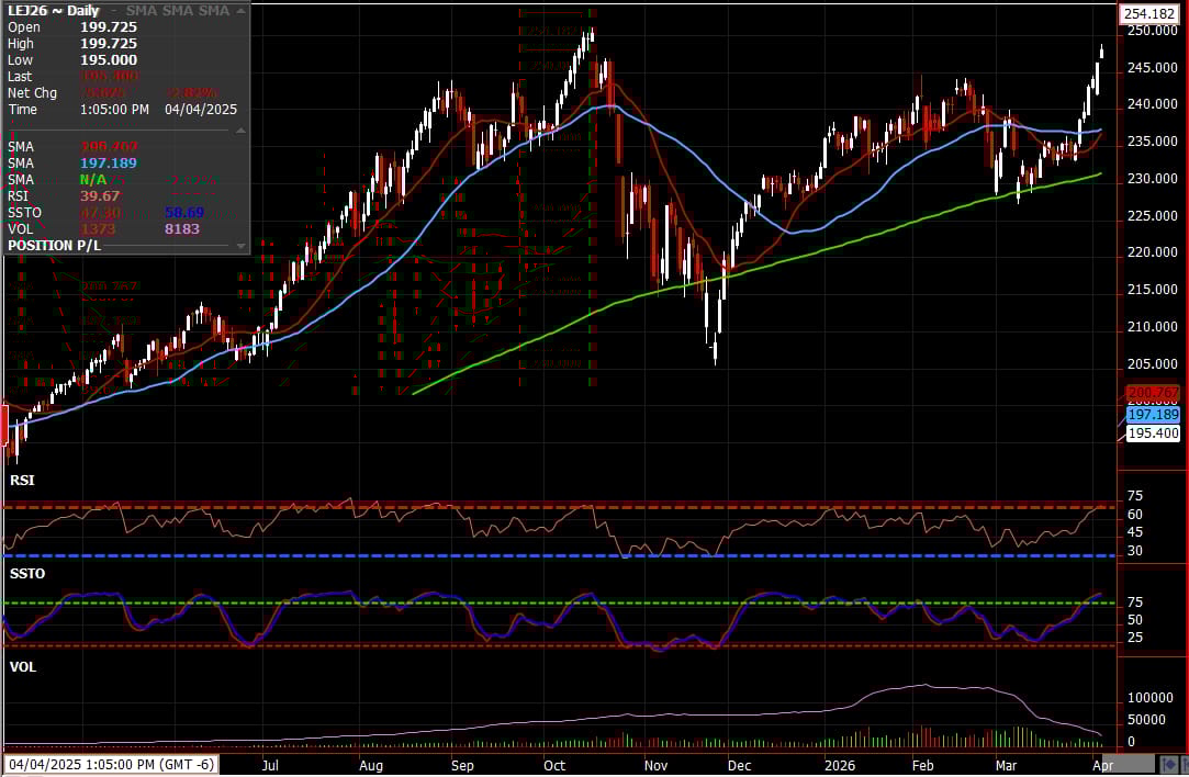 Looking at the weekly chart, I'm very ready to be bullish. Cash cattle trading as high as $246.50 last week supported that rally into what was negative basis. If you'd have asked me months ago about having negative basis in April, I would've laughed and said not likely, but here we are. Managed Money bought a bunch of contracts leading up and into last week, and open interest was higher most days of the rally, all great signs for a bull market. And if I had to guess, the packers could've been going long like crazy last week as well.