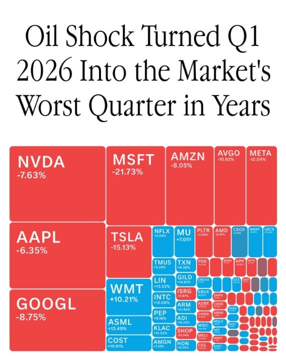 Q1 2026 turned sharply lower as oil surged past $100, triggering a supply shock that rattled equities. AI and tech stocks fell on profit concerns, while energy surged and staples held steady, reflecting a market shift driven by rising costs and geopolitical tension. Is this a short-term shock—or the start of a longer market shift? Join the conversation - comment online!