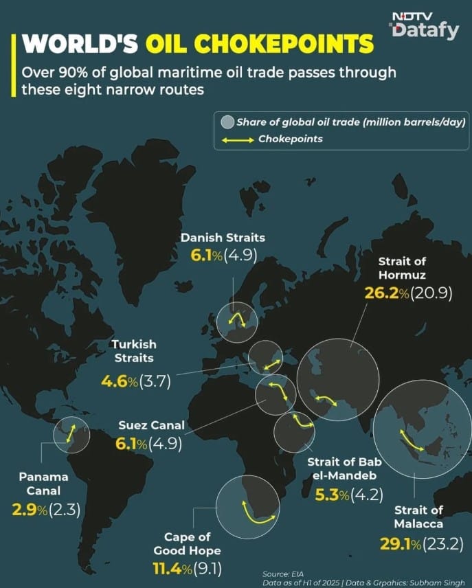 More than 90% of the world’s seaborne oil flows through just eight critical chokepoints—from the Strait of Hormuz to the Panama Canal—making these narrow routes vital arteries of global energy trade and key pressure points for supply, pricing, and geopolitical risk. Join the conversation - comment online!